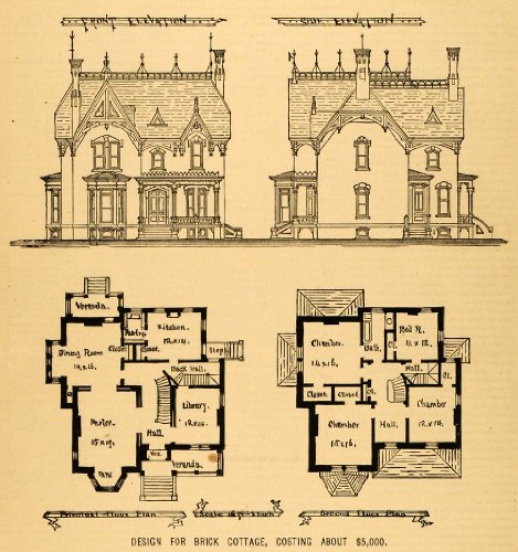 This is an original 1879 halftone print of an architectural sketch of a design for a brick cottage in the village of Ballston Spa, New York, costing about ,000. The sketch shows the exterior of the home and the interior floor plans. The architects for this building were Croff & Camp of 335 Broadway in New York City.